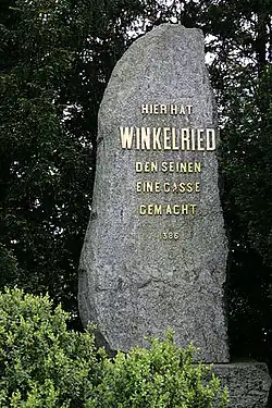 À Sempach, un monument en granit a été érigé à l'endroit où Winkelried serait tombé, non loin de la chapelle bâtie pour commémorer les soldats tombés sur le champ de bataille. On peut y lire : Hier hat WINKELRIED den Seinen eine Gasse gemacht - 1386, une citation que l'on peut traduire par « Ici Winkelried a ouvert la voie aux siens - 1386 ». La stèle fait allusion à la phrase qui aurait été prononcée par le héros avant son assaut : Ich will euch eine Gasse bahnen, sorget für mein Weib und meine Kinder ! (« Je veux vous ouvrir une voie, prenez soin de ma femme et de mes enfants ! »).