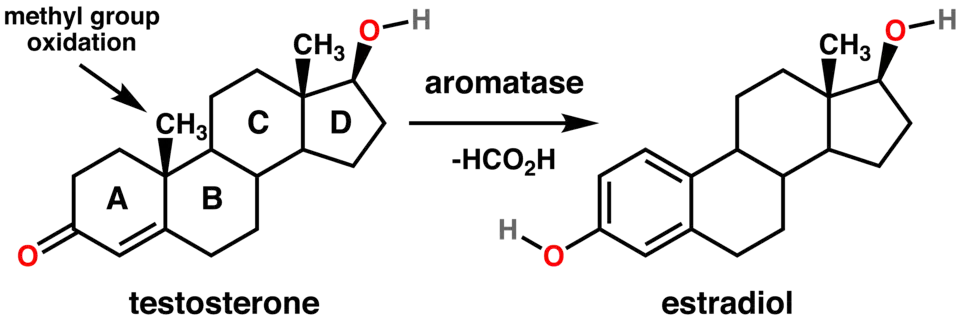 Les stéroïdes sont composés de 4 cycles (nommés de A à D sur la figure ci-dessous). L'aromatase transforme le cycle situé le plus à gauche (le cycle noté A) du stéroïde en cycle aromatique (d'où le nom d'aromatase), par le biais d'une oxydation et de la perte d'un groupement méthyle.