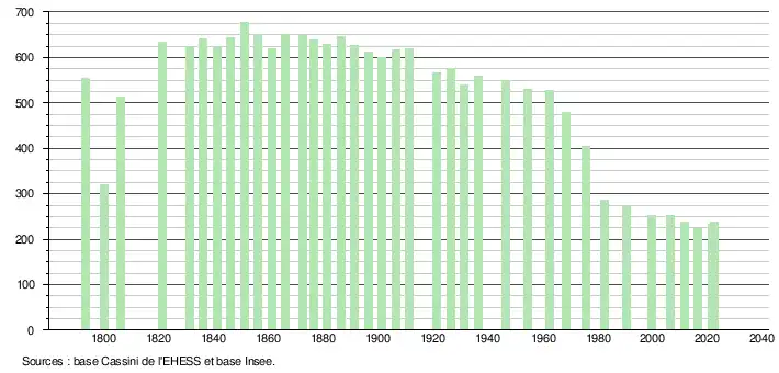 L'évolution du nombre d'habitants est connue à travers les recensements de la population effectués dans la commune depuis 1793. Pour les communes de moins de 10 000 habitants, une enquête de recensement portant sur toute la population est réalisée tous les cinq ans, les populations de référence des années intermédiaires étant quant à elles estimées par interpolation ou extrapolation[28]. Pour la commune, le premier recensement exhaustif entrant dans le cadre du nouveau dispositif a été réalisé en 2006[29].