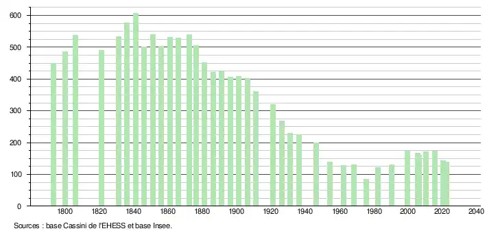 L'évolution du nombre d'habitants est connue à travers les recensements de la population effectués dans la commune depuis 1793. Pour les communes de moins de 10 000 habitants, une enquête de recensement portant sur toute la population est réalisée tous les cinq ans, les populations de référence des années intermédiaires étant quant à elles estimées par interpolation ou extrapolation[31]. Pour la commune, le premier recensement exhaustif entrant dans le cadre du nouveau dispositif a été réalisé en 2005[32].