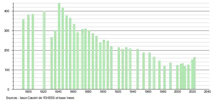- ↑ Population municipale de référence en vigueur au 1er janvier 2025, millésimée 2022, définie dans les limites territoriales en vigueur au 1er janvier 2024, date de référence statistique : 1er janvier 2022.