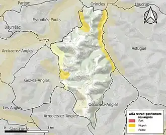 Le retrait-gonflement des sols argileux est susceptible d'engendrer des dommages importants aux bâtiments en cas d’alternance de périodes de sécheresse et de pluie. 11,5 % de la superficie communale est en aléa moyen ou fort (44,5 % au niveau départemental et 48,5 % au niveau national). Sur les 60 bâtiments dénombrés sur la commune en 2019, 1 sont en aléa moyen ou fort, soit 2 %, à comparer aux 75 % au niveau départemental et 54 % au niveau national. Une cartographie de l'exposition du territoire national au retrait gonflement des sols argileux est disponible sur le site du BRGM[19],[Carte 3].