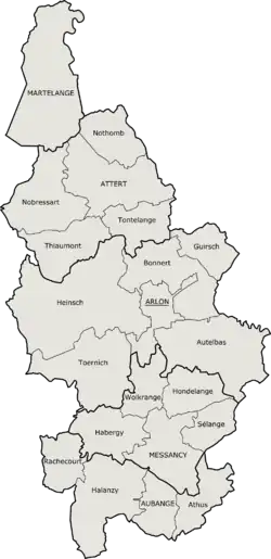 - Canton d'Arlon : Arlon, Attert, Autelbas, Guirsch, Heinsch, Hobscheid, Koerich, Nobressart, Post, Schadeck, Septfontaines, Steinfort, Thiaumont et Toernich.