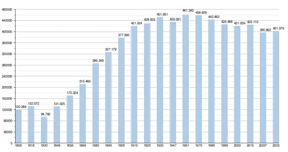 - Source: DGS , de 1806 à 1970=recensements population; à partir de 1980 = nombre d'habitants chaque 1 janvier[1]