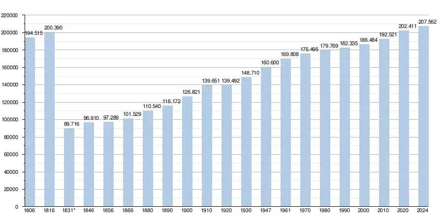 - Source: DGS , de 1806 à 1970=recensements population; à partir de 1980 = nombre d'habitants chaque 1 janvier[1]