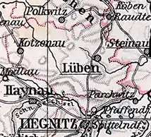 De son côté, l'arrondissement de Lüben cède à l'arrondissement de Liegnitz les villages de Bienowitz, Briese, Grünthal, Herrndorf, Hummel, Kuchelberg, Merschwitz, Mittel Langenwaldau, Nieder Langenwaldau, Ober Langenwaldau, Panthen, Pfaffendorf, Pohlschildern, Rüstern, Schönborn, Sechshufen-Langenwaldau, Schwarzvorwerk, Thiergarten et Töpferberg[3] L'administrateur de l'arrondissement est à nouveau basé à Lüben.
