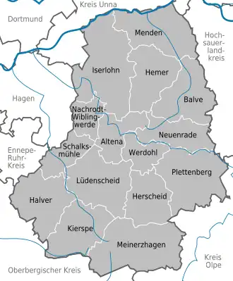| Villes principales | Iserlohn, Lüdenscheid, Menden (Sauerland), Hemer, Plettenberg, Meinerzhagen, Altena, Werdohl |
