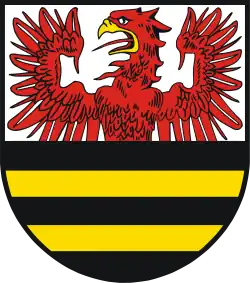 Blason : « Partagé ; au-dessus en argent un aigle rouge en croissance blindé d'or, en dessous en noir deux barres dorées. "