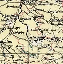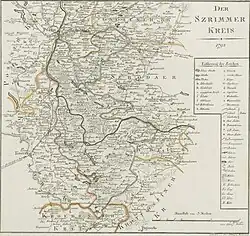 Après le troisième partage de la Pologne de 1793 à 1807, le territoire autour de la ville de Schrimm en Grande-Pologne appartient à l'arrondissement de Schrimm dans la province prussienne de Prusse-Méridionale[2]. Grâce à la paix de Tilsit, la région devient une partie du duché de Varsovie en 1807. Après le Congrès de Vienne, elle tombe de nouveau aux mains du royaume de Prusse le 15 mai 1815 et devient une partie du district de Posen dans le grand-duché de Posen[3].