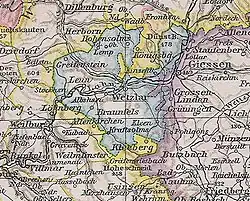 L'arrondissement de Wetzlar est fondé en 1816 dans le district de Coblence de le grand-duché du Bas-Rhin et est une exclave de la province de Rhénanie jusqu'en 1932[1]. L'arrondissement de Braunfels (de), également fondé en 1816, est intégré à l'arrondissement de Wetzlar en 1822[2].
