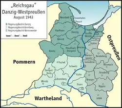 Quelques jours après le début de la Seconde Guerre mondiale, le territoire de l'arrondissement, proche de la frontière et stratégiquement important en raison du tracé de la voie ferrée de l'Est est occupée par les troupes allemandes. Le 26 octobre 1939, la zone est annexée par le Reich allemand en violation du droit international et devient une partie du district de Bromberg (de) dans le Reichsgau de Dantzig Prusse-Occidentale sous le nom d'arrondissement de Wirsitz . Les 186 communes de l'arrondissement sont initialement regroupées en 16 districts administratifs. Le 1er avril 1942, le district de Nakel-Ville est désigné comme ville selon le code municipal allemand de 1935, tout comme les districts de Friedheim-Ville, Immenheim-Ville, Lobsens-Ville, Weißeck-Villeet Wirsitz-Ville le 1er avril 1943. Vers la fin de l'occupation, l'arrondissement se compose de six villes et de dix districts administratifs. La superficie de l'arrondissement a une superficie de 1162 km²[22].