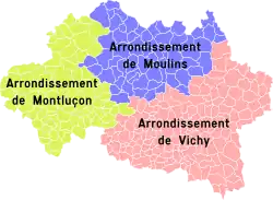 Les trois arrondissements actuels ont comme chefs-lieux : Moulins, Montluçon, Vichy.