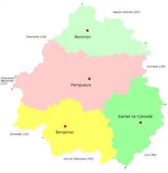 - Au , une réorganisation des arrondissements est effectuée, pour intégrer les récentes modifications des intercommunalités et mieux faire coïncider les arrondissements aux circonscriptions électorales ; 72 communes sur 520 sont affectées : 28 passent de Périgueux vers Nontron, 22 passent de Périgueux vers Sarlat-la-Canéda, 21 de Bergerac vers Périgueux et 1 de Bergerac vers Sarlat-la-Canéda[2],[3].