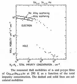 - 1 2 3 Y. Takeda, A. Sasaki, Y. Imamura, and T. Takagi, "Electron mobility and energy gap of In0.53Ga0.47As on InP substrate", J. of Appl. Physics 47, 5405-7 (1976); https://doi.org/10.1063/1.322570