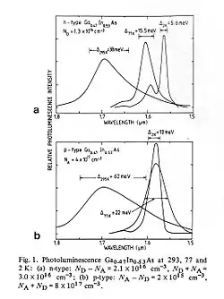 La largeur de bande interdite de GaInAs peut être déterminée à partir du pic du spectre de photoluminescence, pourvu que la concentration totale en impuretés et en défaut soit inférieure à 5 × 1016 cm−3. La largeur de bande interdite dépend de la température et croît lorsque la température diminue, comme peut le voir sur la Fig. 3 sur des échantillons de types n et p. La largeur de bande interdite à température ambiante est de 0,75 eV et se situe entre celle de Ge et de Si. Il se trouve que la largeur de bande interdite de GaInAs est parfaitement adaptée pour les photodétecteurs et les applications laser sur la fenêtre de transmission à longueur d'onde élevée (bandes C et L), pour les télécommunications par fibre optique.