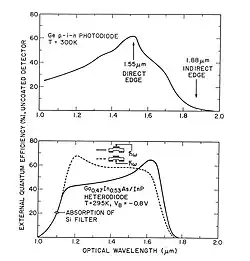 L'intérêt principal de GaInAs est son utilisation comme photodétecteur rapide et à haute sensibilité pour les télécommunications par fibre optique[1]et les capteurs infrarouges[2].