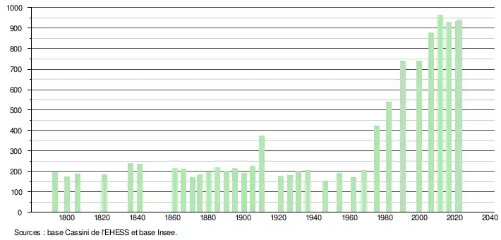 L'évolution du nombre d'habitants est connue à travers les recensements de la population effectués dans la commune depuis 1793. Pour les communes de moins de 10 000 habitants, une enquête de recensement portant sur toute la population est réalisée tous les cinq ans, les populations de référence des années intermédiaires étant quant à elles estimées par interpolation ou extrapolation[19]. Pour la commune, le premier recensement exhaustif entrant dans le cadre du nouveau dispositif a été réalisé en 2006[20].
