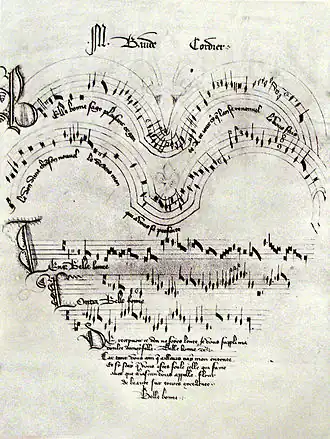 Certaines expérimentations rappellent celles du style d'avant-garde du XXe siècle. Le canon perpétuel Tout par compas de Baude Cordier est noté sur une portée circulaire. La pièce de Jacob Senleches La Harpe de mélodie est écrite en forme de harpe, dans un des manuscrits.