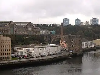 Vue sur le viaduc de la grue revolver, en prolongement des Ateliers du Plateau des Capucins. En toile de fond, les tours de Quéliverzan.