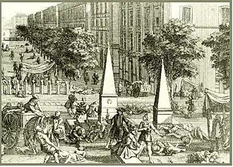 Bien à l’abri de ses murailles et isolé de la ville, l’arsenal des galères ne fut pas ou peu touché par l’épidémie de peste qui ravagea Marseille en 1720. Les seuls forçats qui moururent de la peste furent les fameux « corbeaux » ou fossoyeurs qui furent chargés, à la demande des échevins, d’évacuer les cadavres dans les fosses communes[43]. Il y eut tout d’abord 23 galériens qui furent employés à cette corvée, avec promesse de liberté s’ils échappaient à la peste, ce qui ne fut pas le cas puisqu’ils moururent tous[44]. Ils furent remplacés par plusieurs contingents successifs qui furent placés sous une surveillance de soldats. En effet, les forçats pillèrent les logis abandonnés, achevèrent les moribonds ou les jetèrent dans les chariots avec les morts, ou s’évadèrent en s’habillant avec les vêtements des morts[45]. On estime que 335 forçats moururent à la tâche et que 171 échappèrent à la mort et obtinrent la liberté promise[46].