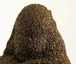 | Habitus | rares cristaux, aciculaires ou en groupement pseudo-cubiques ; rare petit rhomboèdre ; plus communément en agrégat réniforme, noduleux ou globuleux, en masse écailleuse ou grenue de texture squameuse; concrétions lisses, radiées, compactes, lamellaires ; rognons ; masses granulaires mamelonnées et concrétionnées en couches concentriques, parfois réniformes parfois en botryoïdes (grappes de raisin) à structures testacées, masses micro-cristallines granuleuses ; masses fibreuses lamellaires, parfois en colonnes ou stalactites; croûtes parfois blanchâtres ou encroûtements noirs et ternes sur vieux échantillons. |