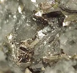 L'éclat métallique est bien visible sur cassure fraîche et irrégulière. Il est parfois blanc d'étain très lumineux ou banalement gris clair. En quelques heures, les surfaces de fracture ternissent et deviennent gris foncé, sombres et mates. Aussi les vieux échantillons massifs sont souvent ternis, voire à éclat terreux.