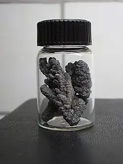 | Éclat | métal sur cassure fraîche (d'abord blanc d'étain, puis ternissement rapide à l'air en gris de fonte), parfois éclat terreux ou terne |