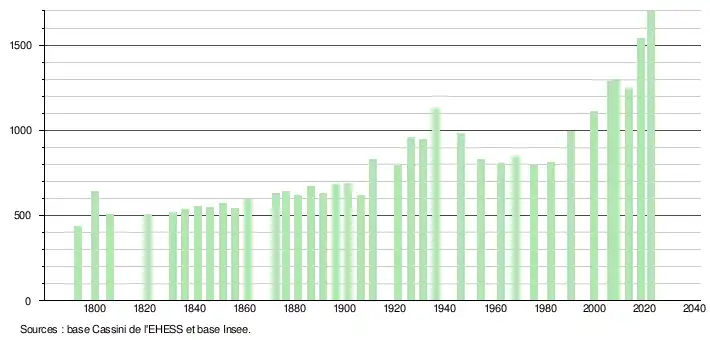 L'évolution du nombre d'habitants est connue à travers les recensements de la population effectués dans la commune depuis 1793. Pour les communes de moins de 10 000 habitants, une enquête de recensement portant sur toute la population est réalisée tous les cinq ans, les populations de référence des années intermédiaires étant quant à elles estimées par interpolation ou extrapolation[28]. Pour la commune, le premier recensement exhaustif entrant dans le cadre du nouveau dispositif a été réalisé en 2008[29].