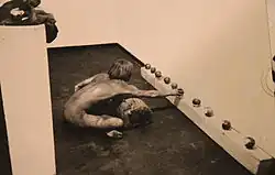 Fondé en 1954 par Jiro Yoshihara, gutaï, gu (instrument) taï (corps) est un mouvement artistique japonais qui se fonde sur l'action du corps et sur l'importance de la matière qui agit par ce corps[11]. À la différence de l'action painting qui ne s'intéresse qu'à la peinture comme matière, les artistes de gutaï pousseront beaucoup plus loin la notion d'automatisme, ils feront des choix inventifs de matière, de support, d'action et de mode de présentation jamais réalisés auparavant. Les modes d'expressions visent à investir la totalité de l'espace et la participation des spectateurs, et reposent généralement sur une action corporelle exacerbée. À titre d'exemple, le cas de Kazuo Shiraga réalisant de grandes toiles peintes avec ses pieds: accroché à une corde fixée au plafond, qui lui permet de garder l'équilibre mais aussi, en s'y suspendant, de moduler son piétinement du pigment sur le support. Celle de Saburo Murakami, traversant d'un coup un tunnel de vingt et un écrans de papier kraft en les crevant de ses poings dans un vacarme terrifiant[11].