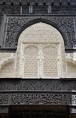 L'art maghrébin acquiert le goût gothique du vitrail et de l'exubérance géométrique et figurative, il utilise pour ce faire le parement de stuc, qui reprend les motifs de fils sans fins d'arcs outrepassés, polylobés, de lambrequins et de muqarnas. Les motifs végétaux résident dans un jeu habile entre rinceaux de vigne stylisés, du plus pur style oriental, la palme (un palmier dattier stylisé) et la pomme de pin.