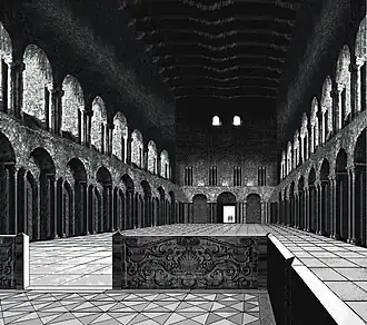 Les grandes églises de plan basilical, qui comportaient une charpente en bois, ne résistèrent malheureusement pas aux incendies, accidentels ou allumés par les pirates normands, les Sarrasins ou les cavaliers hongrois lors de leurs incursions ainsi qu'au cours des luttes entre les différentes lignées mérovingiennes. Mais la plupart d'entre elles ont disparu avant tout par la volonté du clergé de construire des édifices plus "modernes". La description laissée par l'évêque Grégoire de Tours dans son "Histoire ecclésiastique des Francs" de la basilique Saint-Martin, construite à Tours vers 472, fait regretter la disparition de cet édifice qui fut l'une des plus belles églises mérovingiennes. L'église Saint-Pierre de Vienne offre un bon exemple de la typologie architecturale intérieure d'une basilique charpentée au VIe siècle.