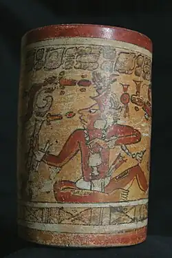De nombreux vases peints illustrent des épisodes mythiques qui ont l'inframonde pour cadre. Certaines images sont à rapprocher de passages du Popol Vuh. On trouve fréquemment des scènes de cour où un haut personnage, assis sur son trône, reçoit l'hommage de sujets, accueille des guerriers ou des ambassadeurs, préside des sacrifices. Les vases cylindriques se prêtent le mieux à la représentation de ces scènes complexes qui traitent de la mythologie ou de la vie à la cour des souverains. La forme cylindrique requiert cependant de la part de l'artiste une habileté exceptionnelle, car celui-ci ne voit qu'une partie de la composition à la fois[5]. La céramique de cette période se décline en nombreux styles régionaux ou locaux, auxquels les céramologues modernes ont donné des noms. Identifié par les spécialistes dans les années 1970, le style dit "codex", nommé par Michael D. Coe, d'après les livres (ou codex) mayas de l'Époque postclassique, représente l'apogée de la calligraphie maya et de la peinture au trait fin. Répandu dans la région de Calakmul, il se caractérise par des scènes et des textes glyphiques exécutés à l'aide de lignes sombres sur des fonds de couleur crème, la décoration étant généralement encadrée par des bandes rouges sur les bords des récipients.