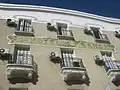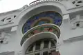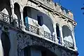 Les balcons des trois étages sont liés par des colonnes torses en marbre rose et couronnés par des chapiteaux à motifs floraux[9]. Les motifs ondoyants des ferronneries des balcons sont caractéristiques de l'Art nouveau[9]. Les baies du dernier étage ont des impostes en mosaïque représentant un bouquet de bleuets[9].