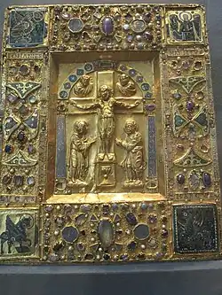 Les objets liturgiques ottoniens sont nombreux à avoir été conservés. Parmi les couvertures luxueuses de codex, on retient celle du Livre des péricopes d'Henri II, celle de l’Évangéliaire d'Otton III, celle du Codex Aureus d'Echternach[32], mais aussi deux remarquables couvertures lombardes : la Paix d'Aribert[33], dont la crucifixion d'or repoussé en ronde-bosse est entourée d'un réseau d'émaux, et la Paix de Chiavenna[34], présentant une croix aniconique entourée de lames d'or repoussées présentant les symboles des quatre évangélistes, et différentes plaques d'émail figuratives ou décoratives.