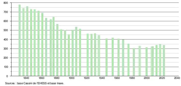 L'évolution du nombre d'habitants est connue à travers les recensements de la population effectués dans la commune depuis 1831. Pour les communes de moins de 10 000 habitants, une enquête de recensement portant sur toute la population est réalisée tous les cinq ans, les populations de référence des années intermédiaires étant quant à elles estimées par interpolation ou extrapolation[16]. Pour la commune, le premier recensement exhaustif entrant dans le cadre du nouveau dispositif a été réalisé en 2007[17].
