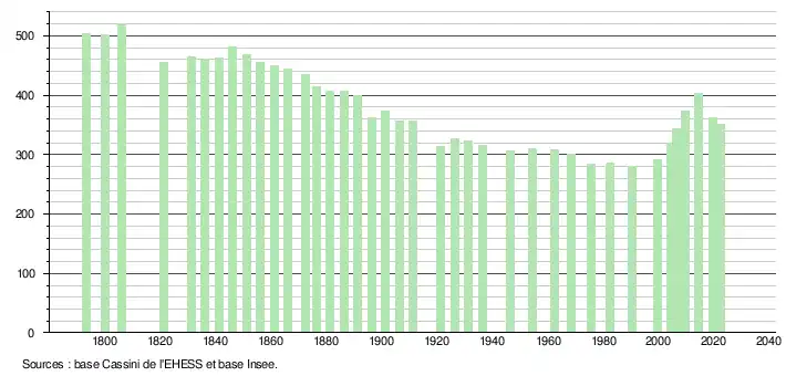 L'évolution du nombre d'habitants est connue à travers les recensements de la population effectués dans la commune depuis 1793. Pour les communes de moins de 10 000 habitants, une enquête de recensement portant sur toute la population est réalisée tous les cinq ans, les populations de référence des années intermédiaires étant quant à elles estimées par interpolation ou extrapolation[26]. Pour la commune, le premier recensement exhaustif entrant dans le cadre du nouveau dispositif a été réalisé en 2004[27].