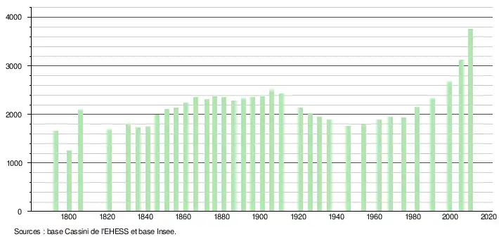 L'évolution du nombre d'habitants est connue à travers les recensements de la population effectués dans la commune depuis 1793. À partir du , les populations légales des communes sont publiées annuellement dans le cadre d'un recensement qui repose désormais sur une collecte d'information annuelle, concernant successivement tous les territoires communaux au cours d'une période de cinq ans. Pour les communes de moins de 10 000 habitants, une enquête de recensement portant sur toute la population est réalisée tous les cinq ans, les populations légales des années intermédiaires étant quant à elles estimées par interpolation ou extrapolation[18]. Pour la commune, le premier recensement exhaustif entrant dans le cadre du nouveau dispositif a été réalisé en 2005[19],[Note 2].