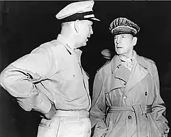 Radford est un admirateur de MacArthur et un partisan de sa stratégie « Asia First (en) »[41]. Il appuie l'opération Chromite en [42],[43], ainsi que la mission des Nations unies en faveur de la réunification de la Corée. Il assiste à la conférence de l'île de Wake (en) entre MacArthur et Truman le 15 octobre et il rappelle sa conviction que, si les Chinois interviennent dans la guerre, les États-Unis pourront toujours dominer le conflit à condition de pouvoir frapper avec leur puissance aérienne, les bases chinoises en Mandchourie. Lorsque l'Armée des volontaires du peuple chinois intervient en faveur de la Corée du Nord le mois suivant, Radford partage la frustration de MacArthur à l'égard des restrictions imposées aux forces de l'ONU qui leur interdisent de frapper le sol chinois. Après le renvoi du général Douglas MacArthur par le Président Truman (en) en , Radford accueille en héros le général, alors en escale à Hawaï sur la route de son retour aux États-Unis[41].