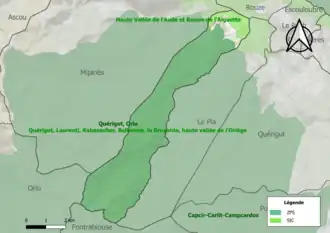 - « vallée et bassin versant de l'Oriège » (8 937 ha), couvrant 9 communes dont 6 dans l'Ariège et 3 dans les Pyrénées-Orientales[23] ;