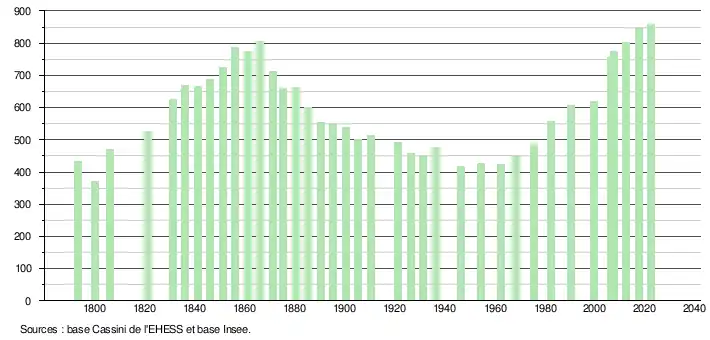 L'évolution du nombre d'habitants est connue à travers les recensements de la population effectués dans la commune depuis 1793. Pour les communes de moins de 10 000 habitants, une enquête de recensement portant sur toute la population est réalisée tous les cinq ans, les populations de référence des années intermédiaires étant quant à elles estimées par interpolation ou extrapolation[27]. Pour la commune, le premier recensement exhaustif entrant dans le cadre du nouveau dispositif a été réalisé en 2007[28].