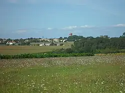 Le centre-ville depuis la route de Villeneuve, en venant d'Étaules. Au second plan, l'église Saint-Étienne (XVIIe siècle). | |||||