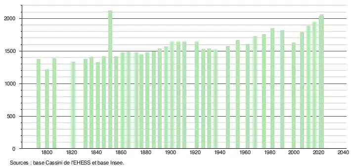 L'évolution du nombre d'habitants est connue à travers les recensements de la population effectués dans la commune depuis 1793. Pour les communes de moins de 10 000 habitants, une enquête de recensement portant sur toute la population est réalisée tous les cinq ans, les populations de référence des années intermédiaires étant quant à elles estimées par interpolation ou extrapolation[37]. Pour la commune, le premier recensement exhaustif entrant dans le cadre du nouveau dispositif a été réalisé en 2006[38].