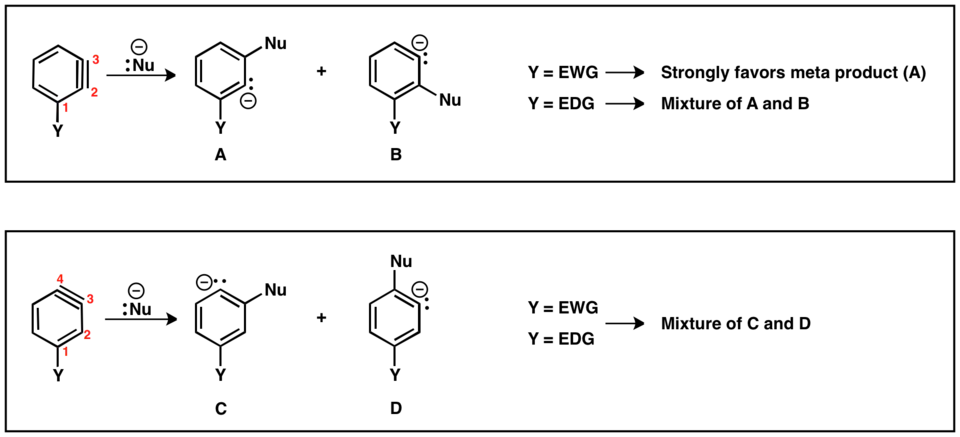 Il existe deux régioisomères possibles de benzyne avec le substituant (Y) : la triple liaison peut être positionnée entre C2 et C3 ou entre C3 et C4. Les substituants ortho du groupe partant conduiront à la liaison triple entre C2 et C3. Y et LG conduiront à un régioisomère à liaison triple entre C3 et C4. Le substituant méta peut donner les deux régioisomères décrits ci-dessus. En cas de liaison triple située entre C2 et C3, des substituants électro-attracteurs, par exemple CF3, (GTE) dirigera l'addition de nucléophiles pour placer le carbanion aussi près que possible du GTE. Cependant, les substituants donneurs d'électrons, par exemple CH3 (EDG) entrainera peu de sélectivité entre les produits. Dans le régioisomère où la triple liaison est située entre C3 et C4, l'effet du substituant sur l'addition de nucléophile est diminué et des mélanges de produits para et méta sont souvent obtenus[16].