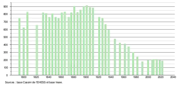 L'évolution du nombre d'habitants est connue à travers les recensements de la population effectués dans la commune depuis 1793. Pour les communes de moins de 10 000 habitants, une enquête de recensement portant sur toute la population est réalisée tous les cinq ans, les populations de référence des années intermédiaires étant quant à elles estimées par interpolation ou extrapolation[31]. Pour la commune, le premier recensement exhaustif entrant dans le cadre du nouveau dispositif a été réalisé en 2008[32].