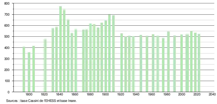 L'évolution du nombre d'habitants est connue à travers les recensements de la population effectués dans la commune depuis 1793. Pour les communes de moins de 10 000 habitants, une enquête de recensement portant sur toute la population est réalisée tous les cinq ans, les populations de référence des années intermédiaires étant quant à elles estimées par interpolation ou extrapolation[19]. Pour la commune, le premier recensement exhaustif entrant dans le cadre du nouveau dispositif a été réalisé en 2007[20].