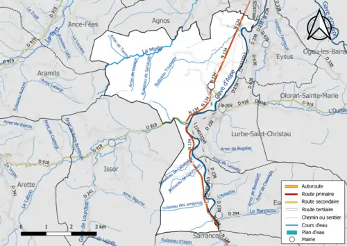 Située dans le bassin versant de l'Adour, la commune est traversée[7] par le gave d'Aspe (qui alimente le gave d'Oloron) et par ses affluents, le gave de Lourdios, les ruisseaux le Barescou, Toupiette, de Labatnère, de Cournalès, l'Arrectou, les arrècs de Bugalas, de Lassalle et des Abérats.