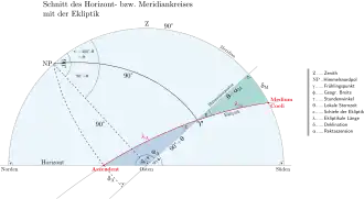 - ↑ et l'intersection de l'écliptique avec l'équateur (perpendiculaire au méridien, lequel relie le Pôle Nord NP au Zénith Z) est le point vernal noté γ.