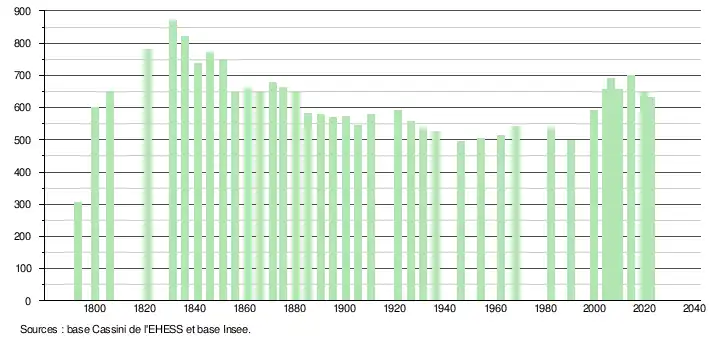 L'évolution du nombre d'habitants est connue à travers les recensements de la population effectués dans la commune depuis 1793. Pour les communes de moins de 10 000 habitants, une enquête de recensement portant sur toute la population est réalisée tous les cinq ans, les populations de référence des années intermédiaires étant quant à elles estimées par interpolation ou extrapolation[17]. Pour la commune, le premier recensement exhaustif entrant dans le cadre du nouveau dispositif a été réalisé en 2004[18].
