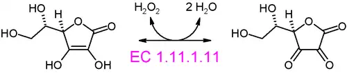 - 2 L-ascorbate + H2O2 + 2 H+ L-ascorbate + L-déshydroascorbate + 2 H2O (réaction globale) :