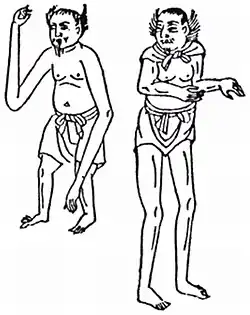 Les sculpteurs de netsuke (netsuke shi) les représentent parfois sous l'aspect d'Indiens, parfois avec un type sémitique, parfois aussi avec un faciès négroïde. On retrouve leur trace dans un livre intitulé Wakan Sansai Zue (和漢三才図会) pour lequel il s'agirait de l'histoire romancée de personnages ayant réellement vécu au Japon sur la rive est de la rivière Shakusui et seraient des Aïnous.
